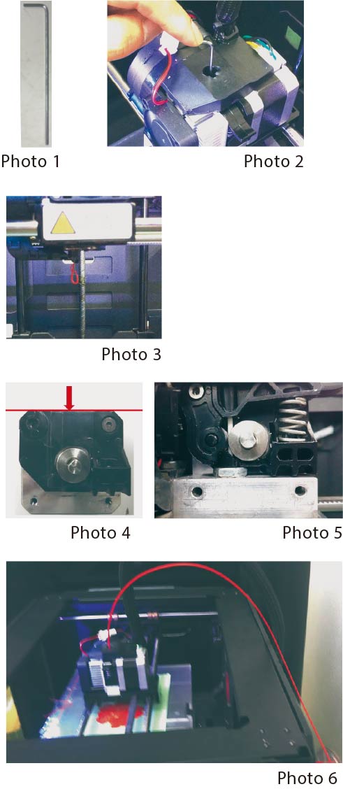 - Please remove filament material left in the nozzle with 1.7 – 1.0 Φ metal stick (cf. Photograph 1 and 2)