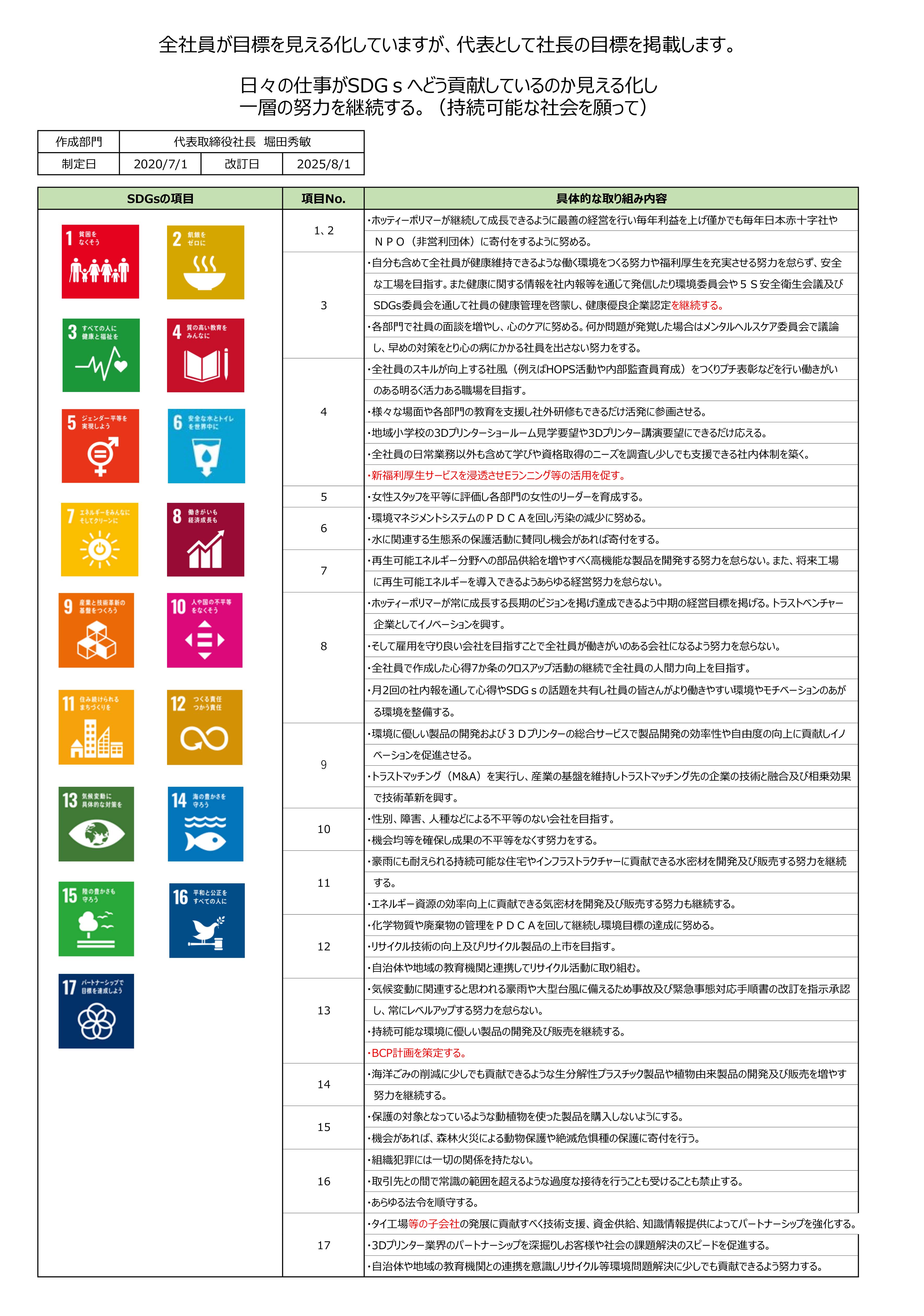 これからも、持続可能な社会を願って、日々の仕事がSDGsへどう貢献しているのか見える化し一層の努力を継続してゆきます。全社員の取り組み内容を見える化していますが、代表して社長の取り組み内容を発表します。