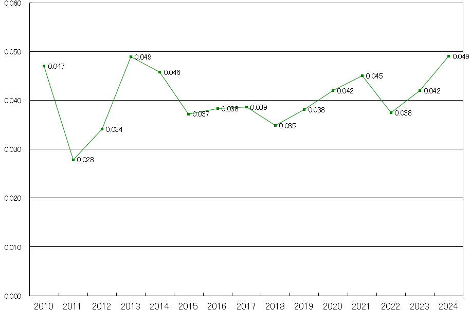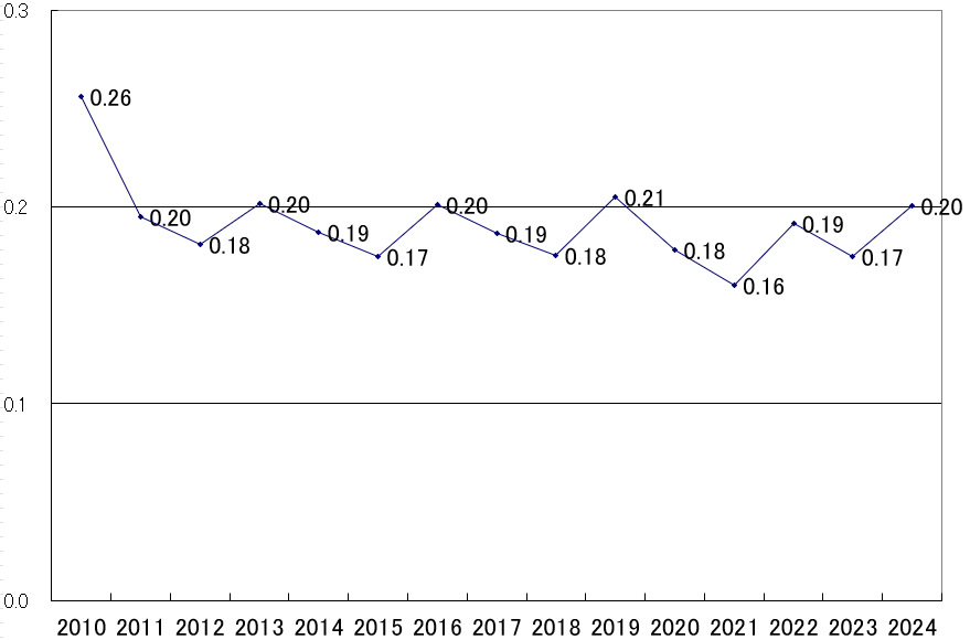 2010年度0.26に対して、改善活動により削減が進み、2021年度は0.16になっています。